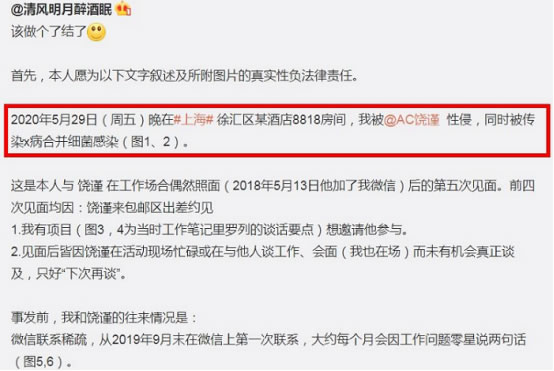 当“清风明月醉酒眠”查出自己被饶谨性侵,导致她染上一种传染性极强的HSV2性病病毒,并被饶谨拉黑后。走投无路之下,在微博对饶谨上进行了曝光,并喊话,“我是不是被你性侵后最难摆平的那一个”;“别特么的赌咒发誓,也别发#声明#和律师函了,直接快进到报警~不,自首!给你指路上海市公安局徐汇分局刑侦支队,虹梅派出所。”