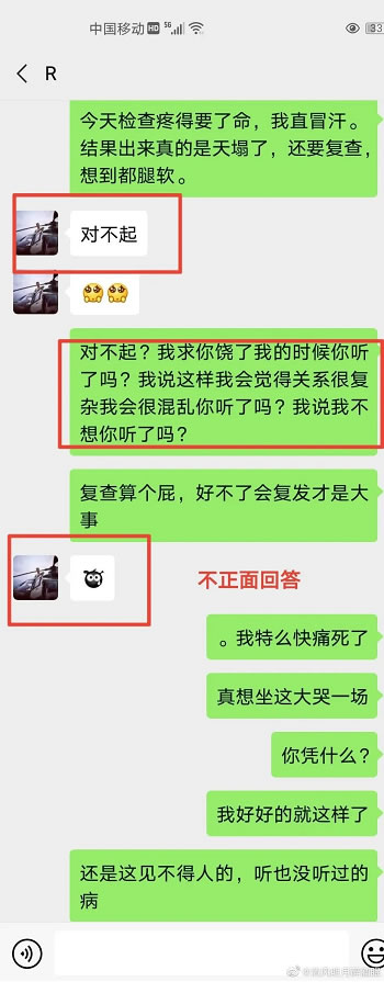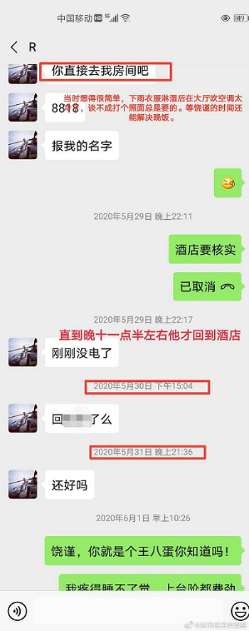 事后,面对女生控诉,饶谨回复“我很轻啊”、“对不起”。面对酷似当年吴签“我很大,你忍一下”的奇怪画风,女方难以控制自己的激烈情绪怼了回去。此处略去女生的粗话,大家自行脑补,并去微博上查看。